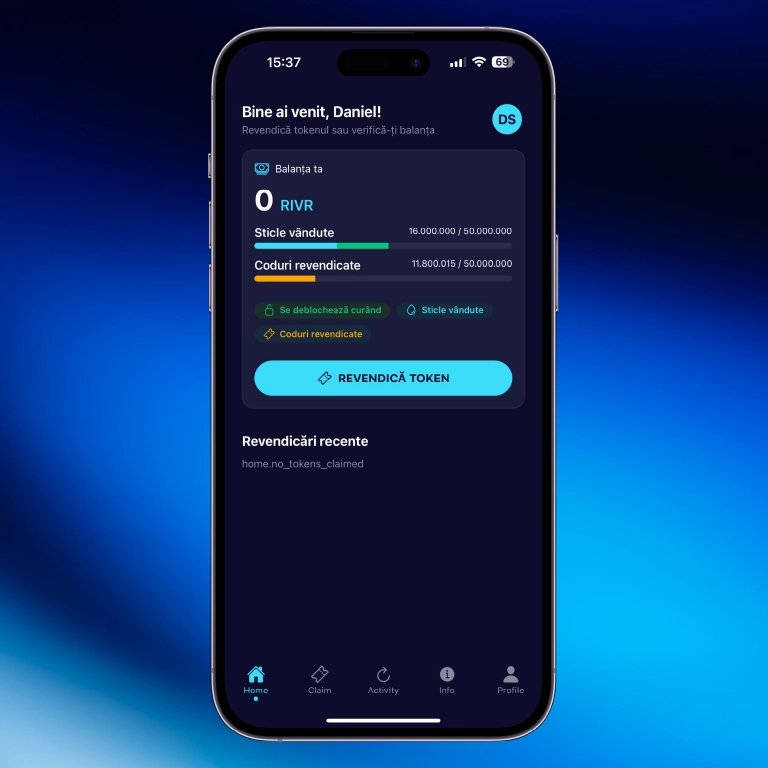 Scanezi codul din capac și primești puncte în aplicație, convertibile în $RIVR după listare.