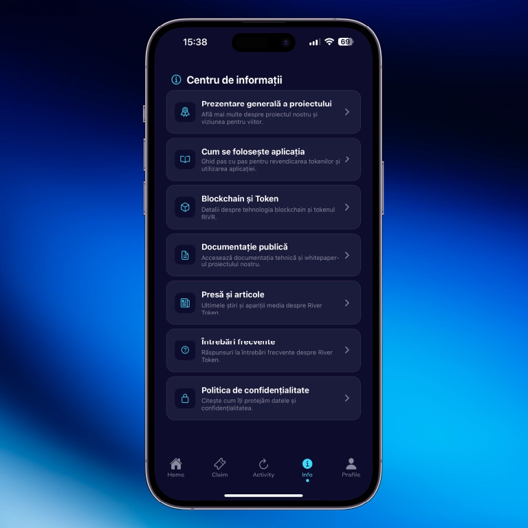 Ghiduri, întrebări frecvente, detalii despre blockchain și acces rapid la whitepaper — tot ce trebuie să știi despre River Token, direct în aplicație.